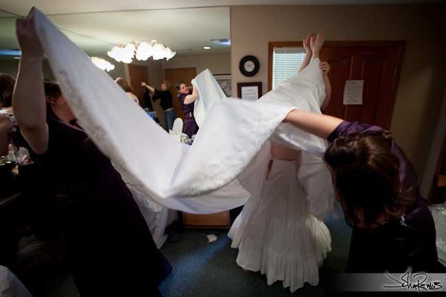 Quick! Everyone hold the dress up! It’s a four-person operation.